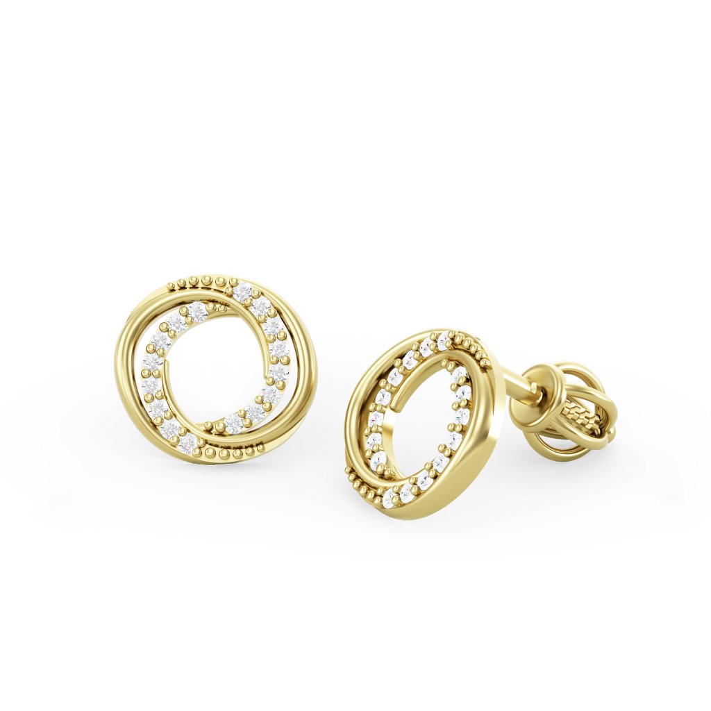 Popis: Zlaté náušnice oválneho tvaru tvorené prelínajúcimi sa líniami. Doplnené dvoma radmi kameňov a ozdobnými prvkami. Náušnice majú praktické skrutkovacie zapínanie. Mimoriadny a nadčasový vzhľad, ktorý dokonale doplní každú príležitosť a zvýrazní krásu nositeľky, nájdete v náušniciach z kolekcie ELICIA. Môžete si vybrať z troch farieb zlata. Veľkosť šperku je 10 mm.