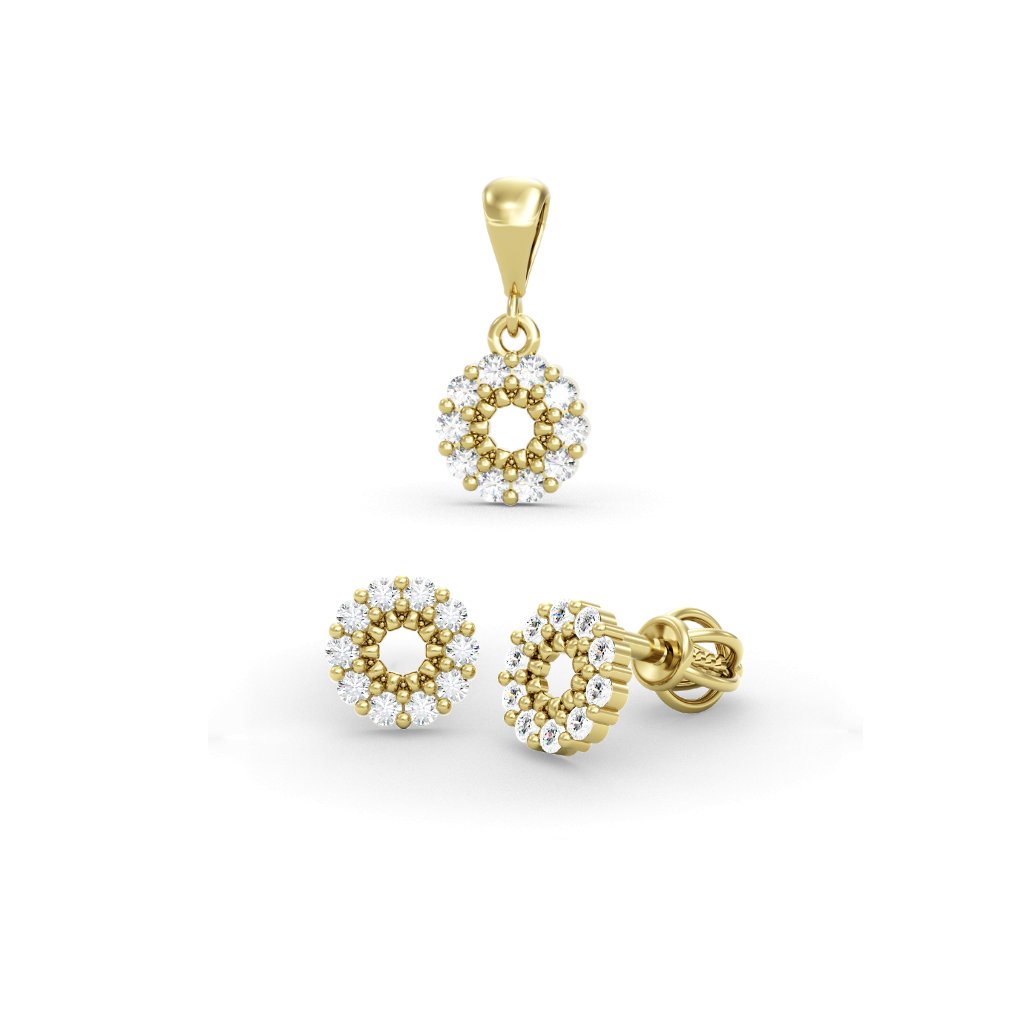 Nadčasová zlatá dievčenská súprava prívesku a náušníc zo žltého zlata s zirkónmi TINA