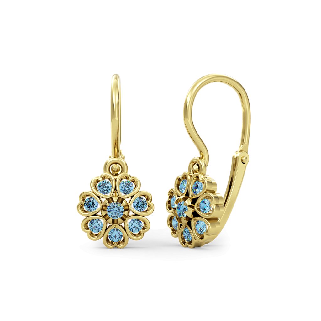 Originálne zlaté detské náušnice so stredne modrými zirkónmi a srdiečkami v tvare kvetu MILETA žlté zlato