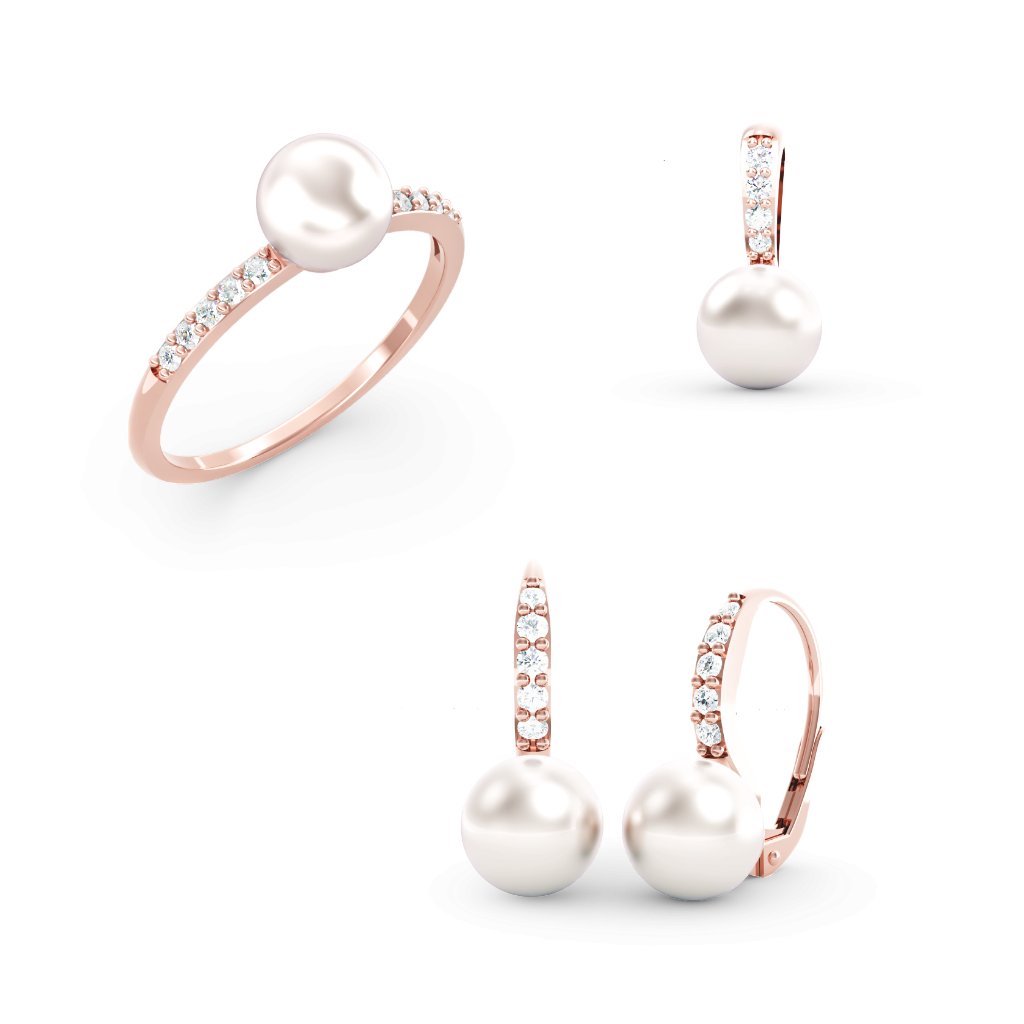 Zlatá SÚPRAVA GRACIA prívesok a náušnice na patent s prsteňom so zirkónmi a perlami ružové zlato