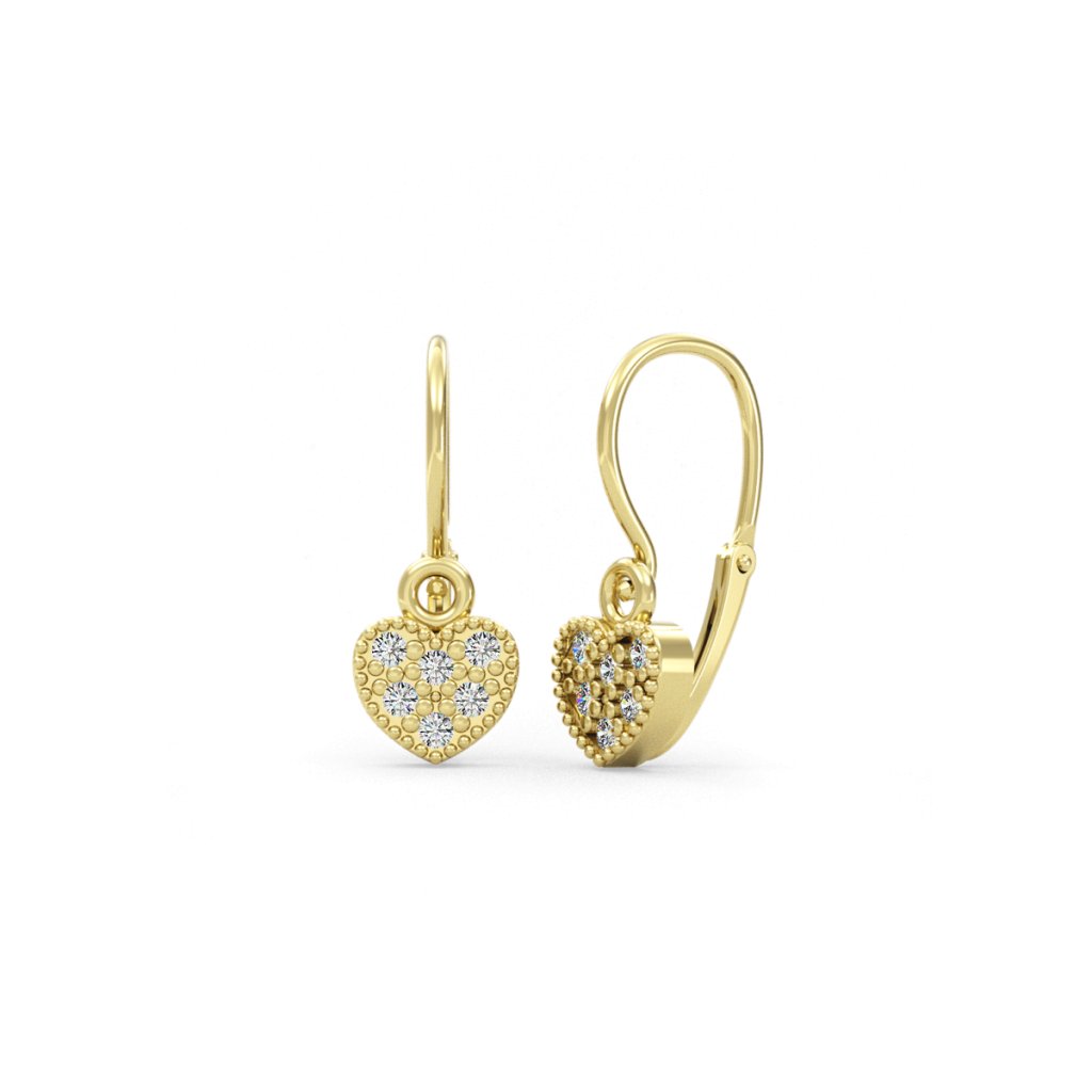 Popis: Zlaté náušnice v tvare srdiečka so šiestimi kamienkami a jemným ozdobným lemom. S praktickým skrutkovacím uzáverom. Šperk žiari ako samotná láska. Náušnice, ktoré si zamilujú malé princezné, Môžete si vybrať z troch farieb zlata. Veľkosť šperku je 4x5 mm.